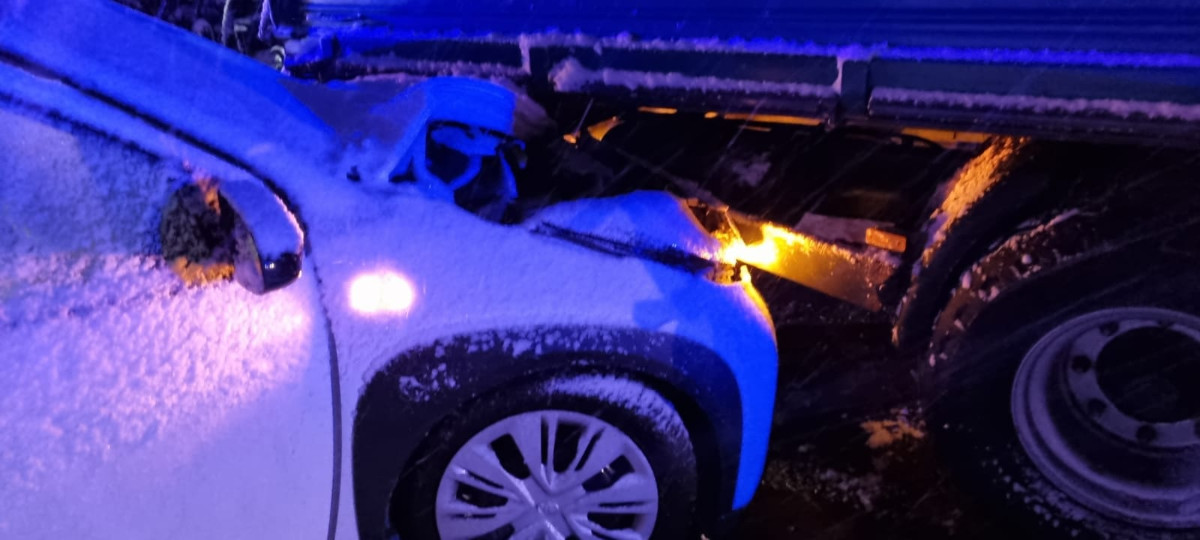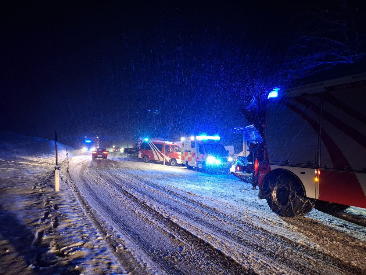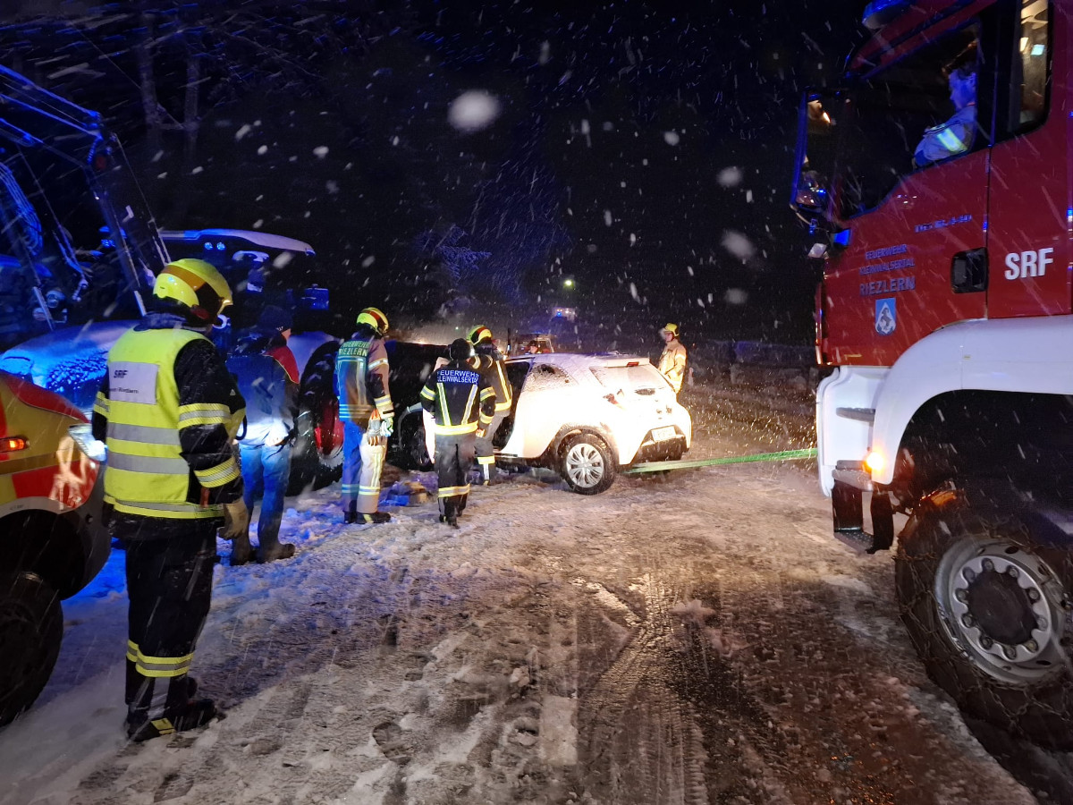 PKW kam auf schneeglatter Fahrbahn von der Straße ab und prallte gegen einen auf einem Privatgrundstück abgestellten Anhänger. Wir haben mittels SRF das Fahrzeug zurück auf die Straße gezogen und gesichert auf einem Parkplatz abgestellt